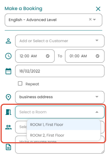 If you want to make a booking and assign it to a Room, simply click on a slot in the diary or click the shortcut booking icon (for more info on how to make a booking see here). The booking form will now give you the option to also select a room for your appointment: