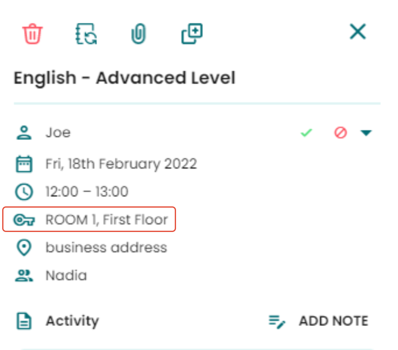 The Room allocated to a booking will show in the booking details, too. Please note Rooms are only visible internally at a staff level. Your customers won't be able to book a specific room or view the Room assigned to an appointment by the staff.