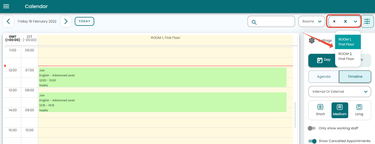 All bookings assigned to a room can be viewed (again on Day view only) by choosing the Rooms view in the calendar and selecting a specific room from the drop-down menu as per the image below: